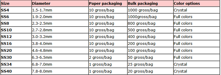 2.Packing: 1Gross is 144 pcs, SS4-SS20: 10 Gross per bag, 1Gross is 144 pcs. SS30: 2 Gross per bag, SS34-SS40: 1 Gross per bag
